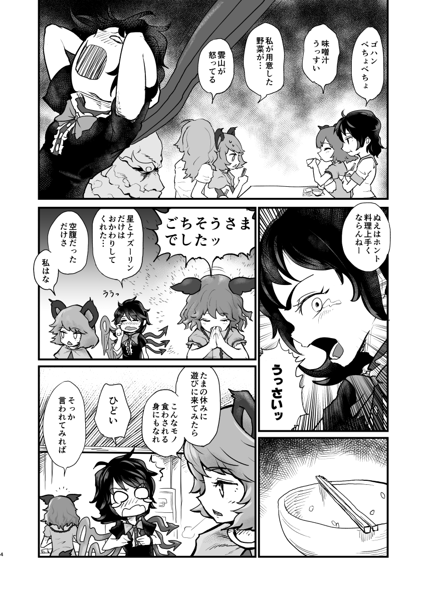 5girls animal_ears asymmetrical_wings bow bowtie capelet comic dog_ears dress goroumaru greyscale highres houjuu_nue kasodani_kyouko kumoi_ichirin long_hair monochrome mouse_ears multiple_girls murasa_minamitsu nazrin sailor_collar short_hair short_sleeves touhou...