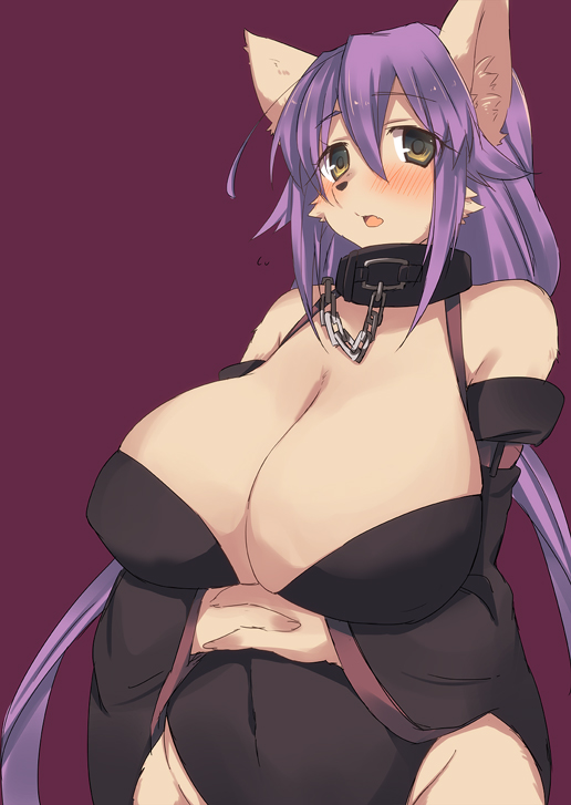 1girl artist_request bare_shoulders big_breasts blush breasts cleavage dog furry huge_breasts long_hair open_mouth purple_hair saigi solo