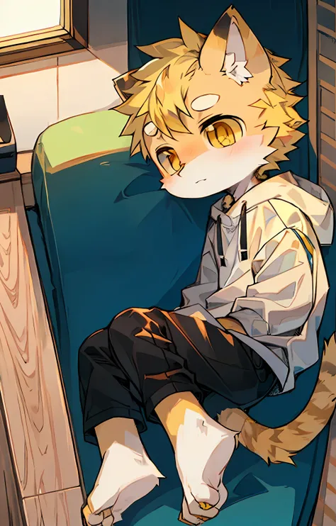 felid.Kids boy.Shota.Yellow hair.Golden eyes.White sweatshirt.Black shorts.Barefoot.adolable.Q version.sprout