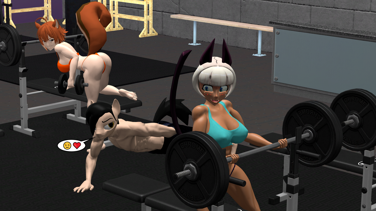derpibooru.orgsuggestive, artist:mr-wolfapex, oc, oc only, oc:kurt marek (electro-crit), humanoid, squirrel, anthro, 3d, blazblue, blushing, catgirl, clothes, emoji, female, gmod, gym, imminent threesome, makoto nanaya, male, ms. fortune, muscles, muscular female, muscular male, partial nudity, sexy, skullgirls, topless