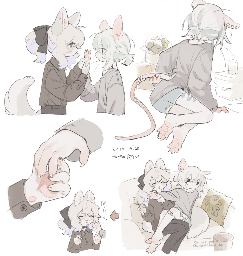 2girls animal_ears artist_name bandaged_tail barefoot black_eyes black_shirt blue_shorts bow cat_ears cat_girl cat_tail closed_eyes commentary couch cushion eye_contact fewer_digits full_body furry furry_female gomafuto grey_eyes grey_shirt hair_bow highres long_sleeves...