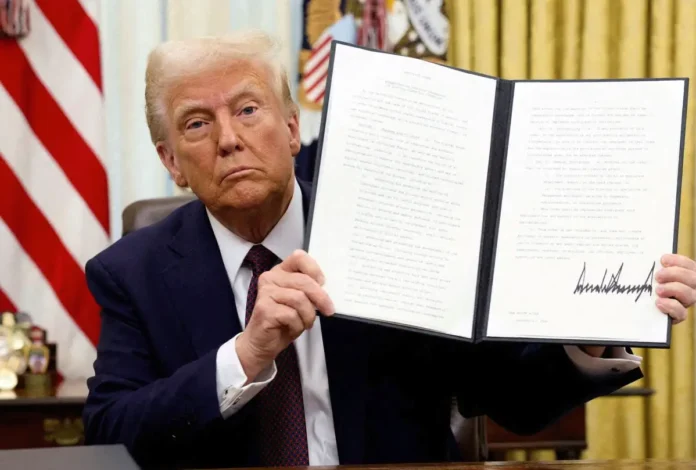 U.S. President Donald Trump holds a signed executive order on cryptocurrencies, in the Oval Office of the White House, in Washington, U.S., on January 23, 2025.