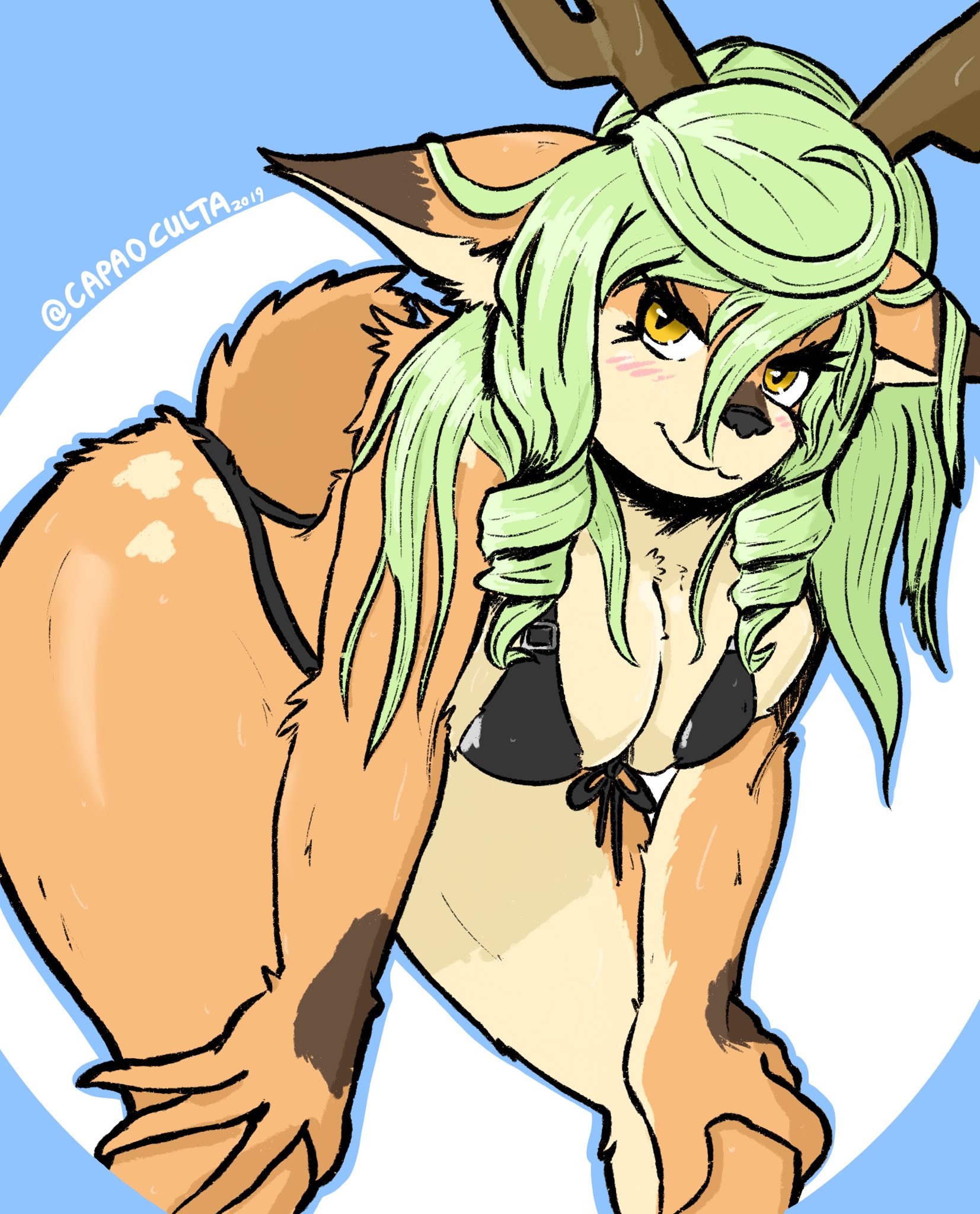 #7514 - suggestive, artist:faeki_dk, oc, oc only, cervid, deer, mammal, reindeer, anthro, 2019, absolute cleavage, all fours, an furbooru.orgsuggestive, artist:faeki_dk, oc, oc only, cervid, deer, mammal, reindeer, anthro, 2019, absolute cleavage, all fours, antlers, beach, bikini, breasts, clothes, cloud, female, huge breasts, kemono, kneeling, looking...