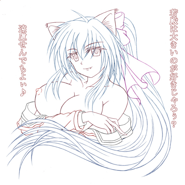 animal_ears bow breasts cat_ears cleavage fang fang_out hair_bow ikkakujyuu large_breasts lineart long_hair nipples noihara_himari omamori_himari ponytail solo translation_request very_long_hair