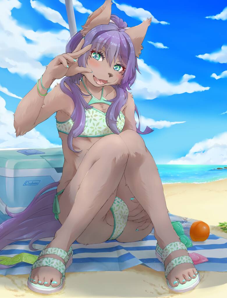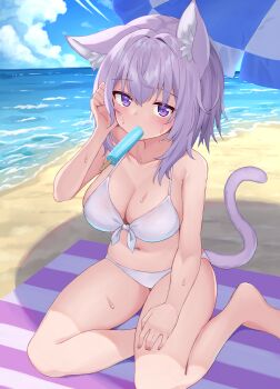 Rule 34 1girl, absurdres, animal ear fluff, animal ears, beach, beach towel, bikini, breasts, cat ears, cat tail, cloud, collarbone, commentary request, food, front-tie bikini top, front-tie top...