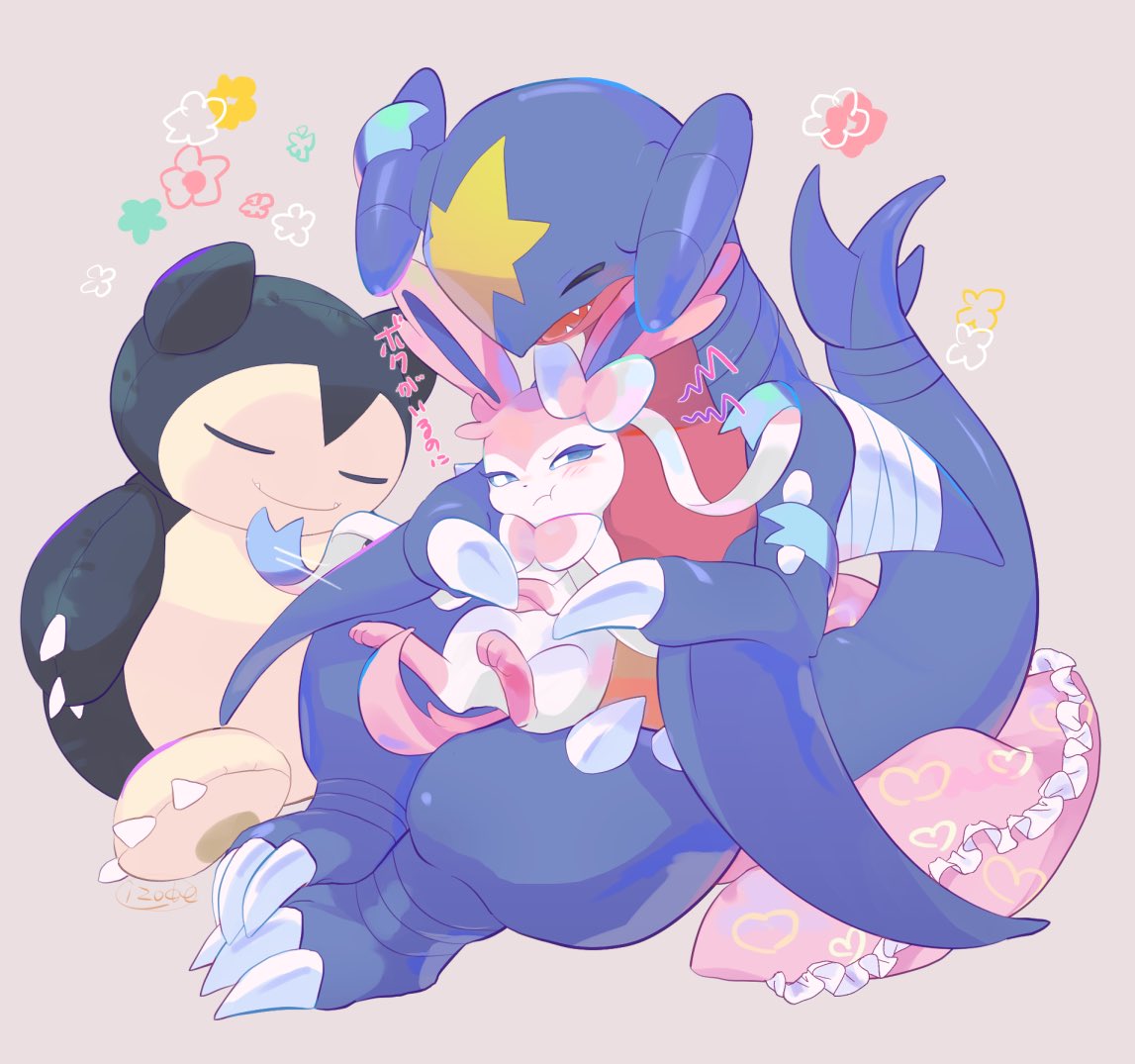 :t bandages blue_eyes blush closed_eyes closed_mouth commentary_request cushion fangs frills garchomp heart izobe motion_lines no_humans open_mouth pokemon pokemon(creature) prehensile_ribbon sitting smile snorlax sylveon toes