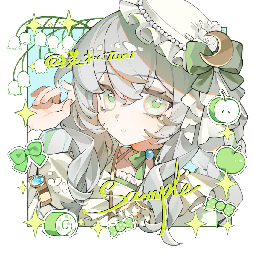 kagamihara.donmai.us1girl apple bow bow_choker candy choker crescent crescent_hat_ornament eyelashes fingernails flower food frills fruit gem green_bow green_choker green_eyes grey_hair hair_between_eyes hat hat_ornament highres lily_of_the_valley long_hair long_sleeves looking_at_viewer... post #8451332.