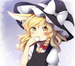 1girl animal_ears blonde_hair blush braid commentary dango eating food hat kemonomimi_mode kirisame_marisa long_hair rabbit_ears riza_dxun side_braid single_braid solo star teeth touhou vest wagashi wavy_hair witch_hat yellow_eyes.