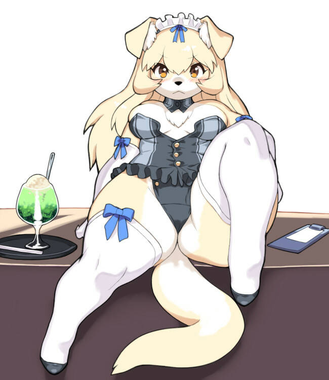 :< anthro armwear bangs bare_shoulders beverage black_nose black_shoes blonde_hair blush breasts breasts_apart canine chest_tuft choker cleavage clipboard clothed clothing countershade_face countershade_tail countershade_torso digital_media(artwork) dog elbow_gloves...