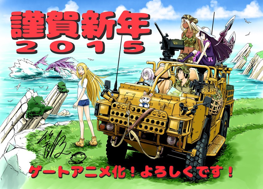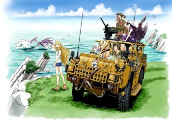 1boy 2015 4girls bird black_hair blonde_hair blue_eyes boots breasts browning_m2 cleavage clouds dark_elf dark_skin driving elf fn_mag gate-jieitai_ka_no_chi_nite_kaku_tatakaeri grass gun halberd hand_on_headwear hat itami_youji jackal(vehicle) lavender_hair...