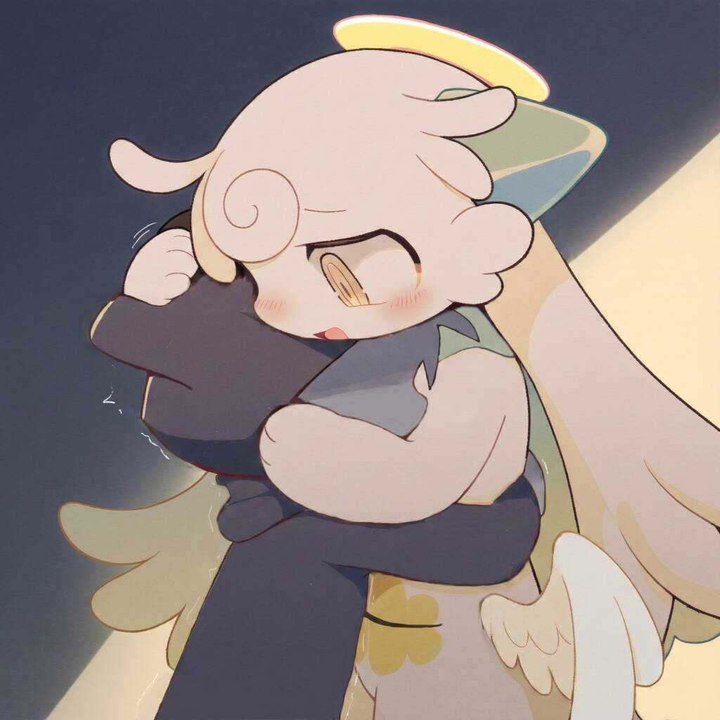 Safebooru - 1boy 1girl 1other 2525nicc ? ?? angel wings antlers blonde hair blue eyes brick buck teeth colored skin commentary r