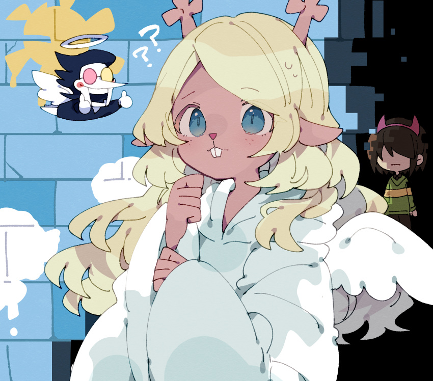 1boy 1girl 1other 2525nicc ? ?? angel_wings antlers blonde_hair blue_eyes brick buck_teeth colored_skin commentary_request deer_antlers deer_girl deltarune fake_horns furry furry_female green_shirt hairband halo heterochromatic_eyewear highres hooded_robe horn_hairband horns...