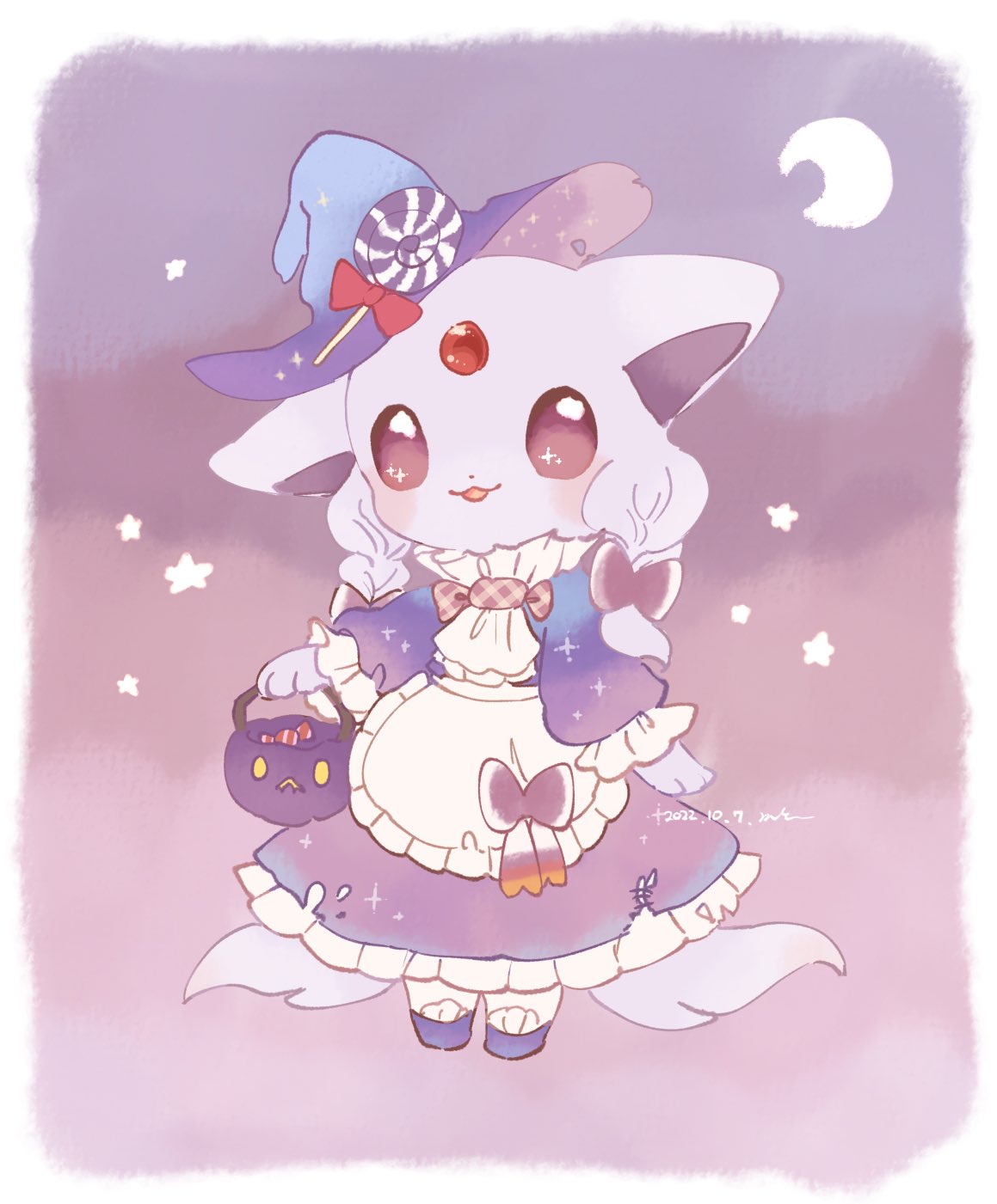 1girl :3 :d animal_ears animal_hands apron border bow braid candy cat_ears crescent dated dress espeon food forehead_jewel frilled_dress frills full_body furry furry_female gem halloween_bucket hat highres lollipop looking_at_viewer...