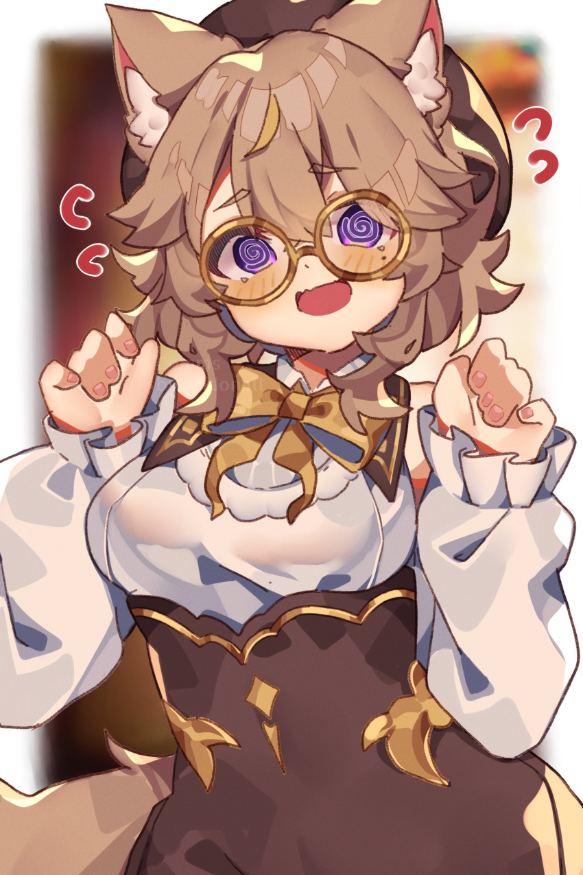 1girl @@ absurdres animal_ears aridonall blush brown_hair cat_ears cat_girl commission eyebrows_visible_through_hair flying_sweatdrops glasses highres long_sleeves looking_at_viewer mole mole_under_eye nervous_smile open_mouth original round_eyewear short_hair solo violet_eyes