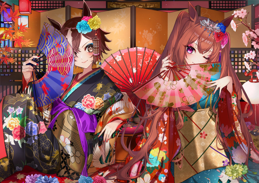 2girls absurdres animal_ears bangs black_kimono branch brown_eyes brown_hair closed_mouth daiwa_scarlet(umamusume) flower folding_fan folding_screen hand_fan hands_up highres holding holding_fan horse_ears japanese_clothes kimono lantern leaf lips long_hair long_sleeves...