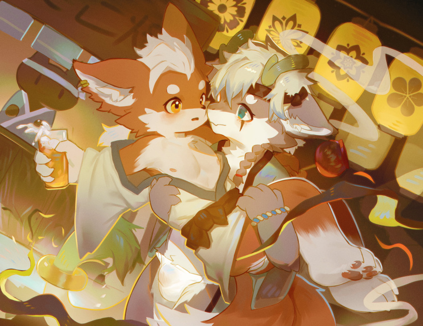 2024 absurd_res anthro asian_clothing balls barefoot blush canid canine clothed clothing cloudcat container cup detailed_background duo east_asian_clothing eye_contact feet fox fundoshi genitals hi_res holding_container holding_cup holding_object holding_partner hors...