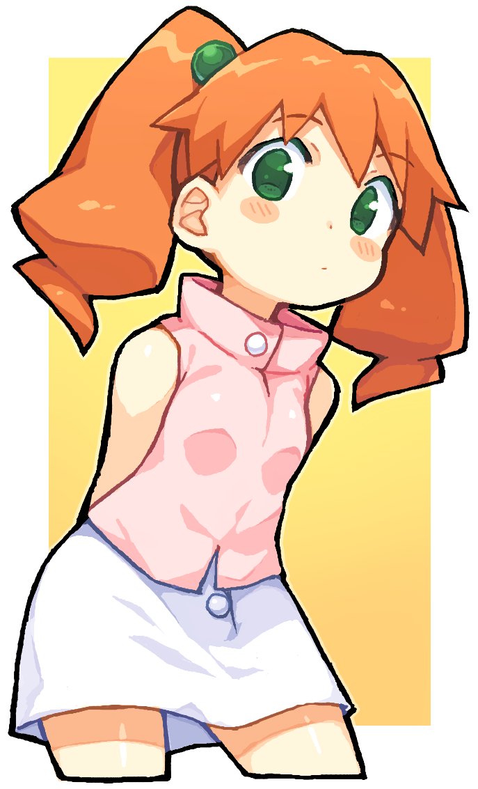 1girl arms_behind_back bachera blush_stickers border cowboy_shot cropped_legs dress green_eyes junmai_karin long_hair looking_at_viewer medarot pink_shirt shirt sleeveless sleeveless_shirt solo twintails white_border white_dress yellow_background