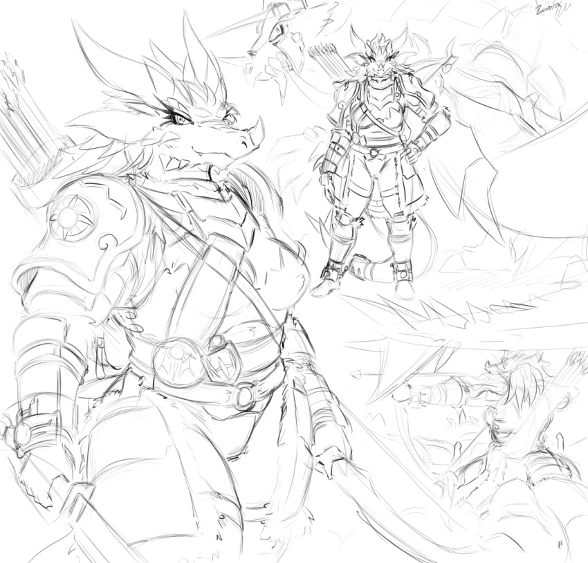 2015 anthro arrow(weapon) biped bow(weapon) breasts dragon duo female feral freida(zerofox1000) looking_at_viewer melee_weapon monochrome quadruped ranged_weapon scalie signature smile sword weapon wingless_dragon zerofox1000