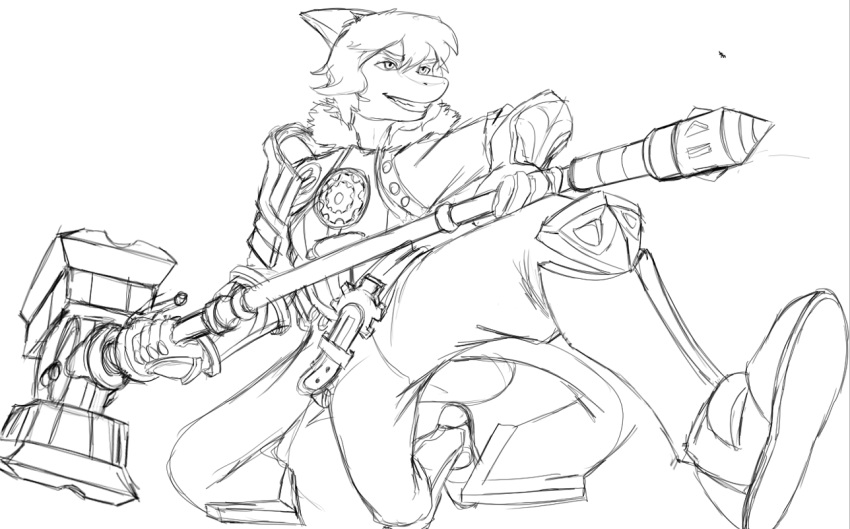 2024 5_fingers anthro armor belt bone_frill cavemanon_studios cosplay crossover crossover_cosplay dinosaur fingers frill(anatomy) hadrosaurid hair hammer jayce(lol) kneeling league_of_legends long_tail male monochrome ornithischian ornithopod parasaurolophus prehistoric_species...