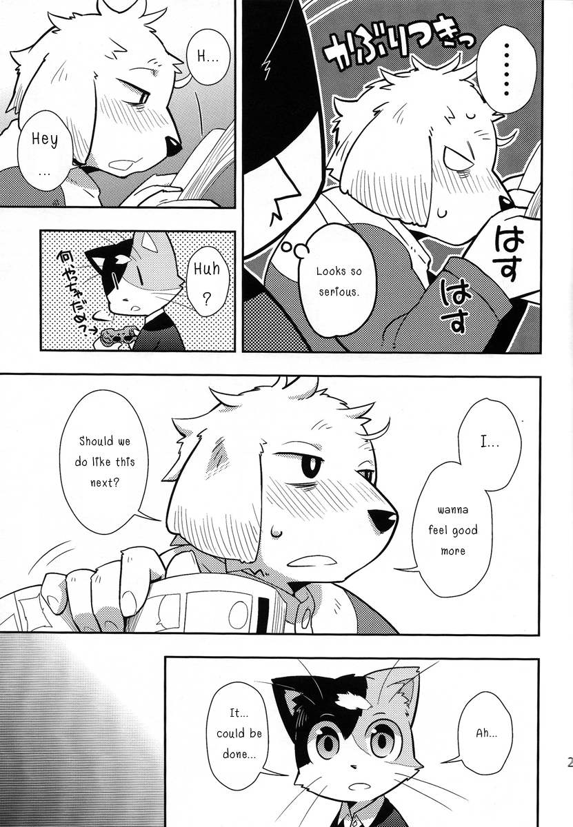 2011 5_fingers anthro biped black_and_white blush bodily_fluids book calico_cat canid canine canis clothed clothing comic controller dialogue domestic_cat domestic_dog duo ellipsis embarrassed empty_eyes english_text engrish felid feline felis...