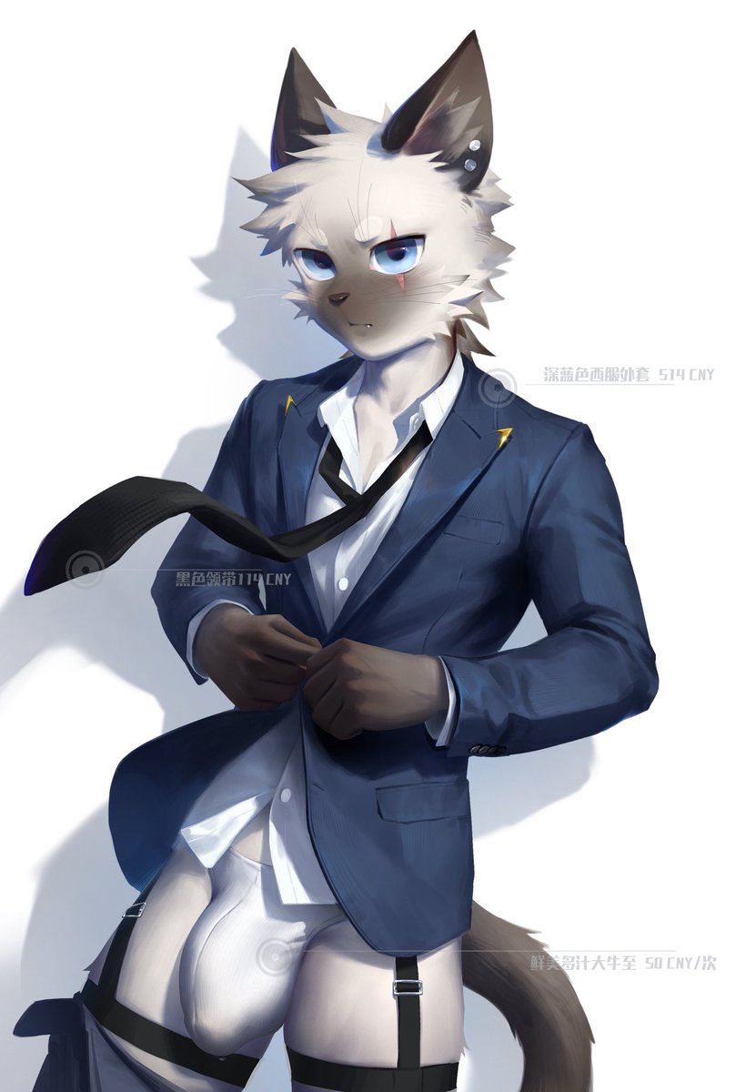 2024 anthro blue_eyes bulge claws clothing detailed_bulge domestic_cat feet felid feline felis fur grey_body grey_fur guaishoudm1 hi_res looking_at_viewer male mammal necktie scar shirt solo tail topwear underwear white_body...