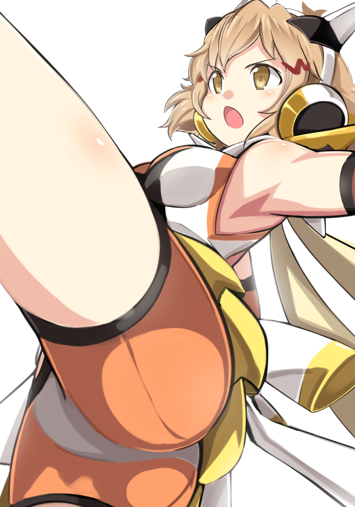 o armpits ass bike_shorts blonde_hair blush bodysuit breasts from_below headphones kicking medium_breasts p_book scarf senki_zesshou_symphogear short_hair standing standing_on_one_leg tachibana_hibiki(symphogear) thighs white_background yellow_eyes