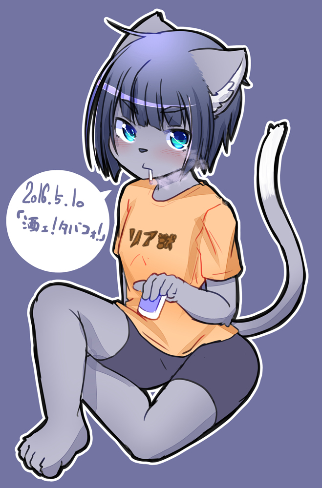 1girl artist_request blue_eyes cat female full_body furry purple_hair short_hair simple_background sitting smoking solo