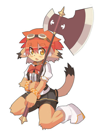 1girl :d animal_nose axe bike_shorts black_shorts blush border cowboy_shot dwarf(totomono) furry furry_female goggles goggles_on_head grey_background hair_between_eyes highres holding holding_axe ken_to_mahou_to_gakuen_mono looking_at_viewer orange_hair short_sleeves shorts...