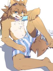 safebooru.org1boy blue_eyes brown_fur brown_hair chest_fur chromatic_aberration food furry furry_male goggles goggles_on_head hand_on_own_hip highres holding holding_food holding_popsicle kanato(sakehabera) little_tail_bronx looking_at_viewer popsicle red_savarin sitting solatorobo solo...