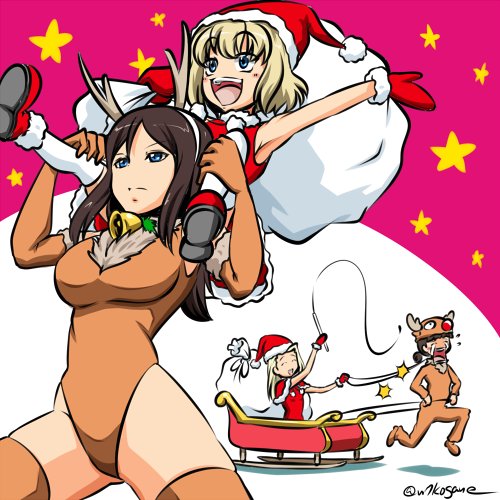 4girls :d animal_costume arm_up bangs bell black_hair blonde_hair blue_eyes brown_bodysuit brown_eyes brown_gloves brown_leotard capelet carrying christmas clara(girls_und_panzer) closed_eyes closed_mouth commentary elbow_gloves expressionless flying_sweatdrops frown...