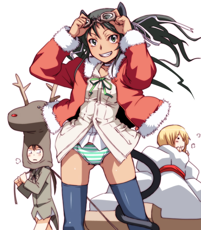 3girls :3 animal_ears bag black_hair blonde_hair blue_legwear bow brown_hair cat_ears choker costume deer dress_shirt erica_hartmann francesca_lucchini gertrud_barkhorn goggles green_eyes green_panties grin hair_ribbon jacket long_hair looking_at_viewer multiple_girls no_pants...