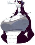 tbib.organthro big_breasts black_body black_hair black_scales breasts breath choker cleavage clenched_teeth clothed clothing cloud_emanata collar countershading crop_top d.e.belton(artist) emanata facial_horn female fin goth_dragon(d.e.belton) hair half-length_portrait...