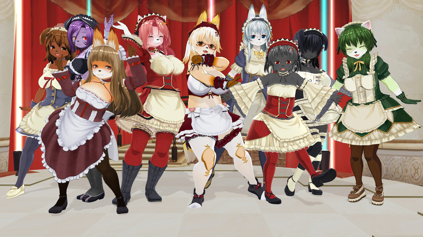 3d 6+girls artist_request black_hair blue_eyes blue_hair brown_eyes brown_hair cat custom_maid_3d_2 dog fox furry green_hair long_hair multiple_girls open_mouth purple_hair red_eyes short_hair wolf