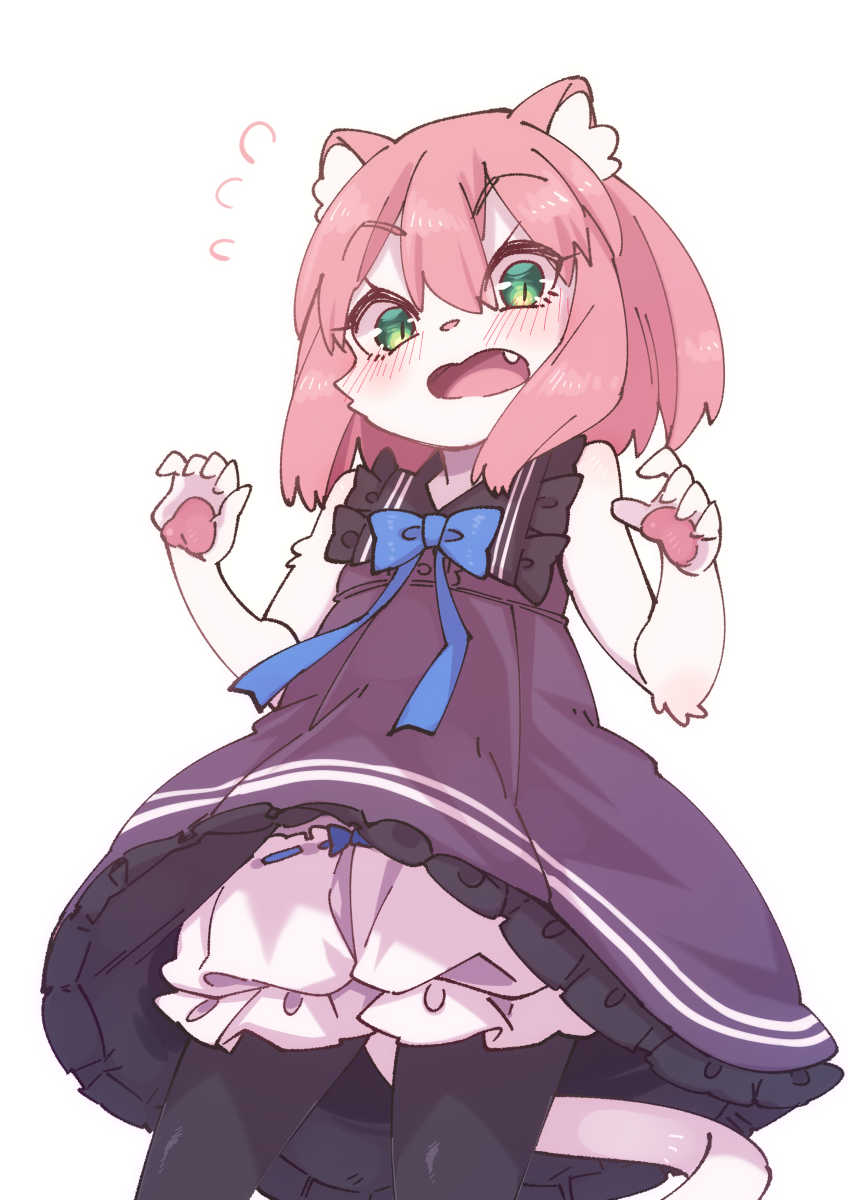 1girl animal_ear_fluff animal_ears arms_up black_dress black_legwear bloomers blush brown_hair cat_ears cat_tail dress fang flying_sweatdrops furry green_eyes highres miku(yuuki(yuyuki000)) open_mouth original pantyhose paws short_hair simple_background sleeveless...