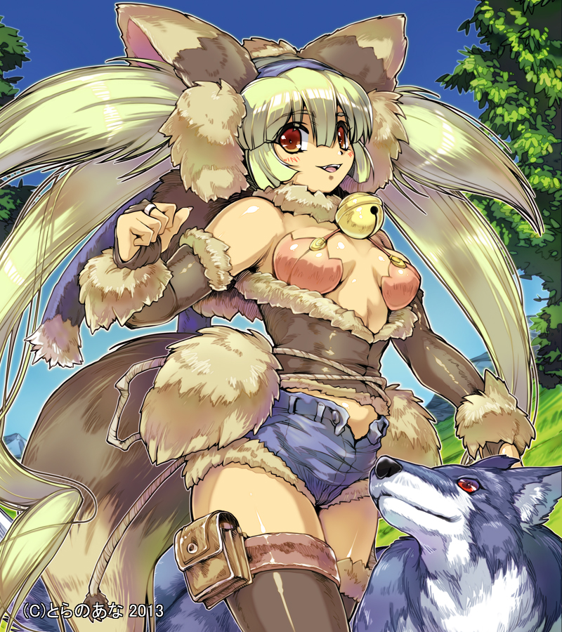 Safebooru - animal ears bell blonde hair breasts bridal gauntlets denim denim shorts fangs hairband hisahiko jingle bell long ha