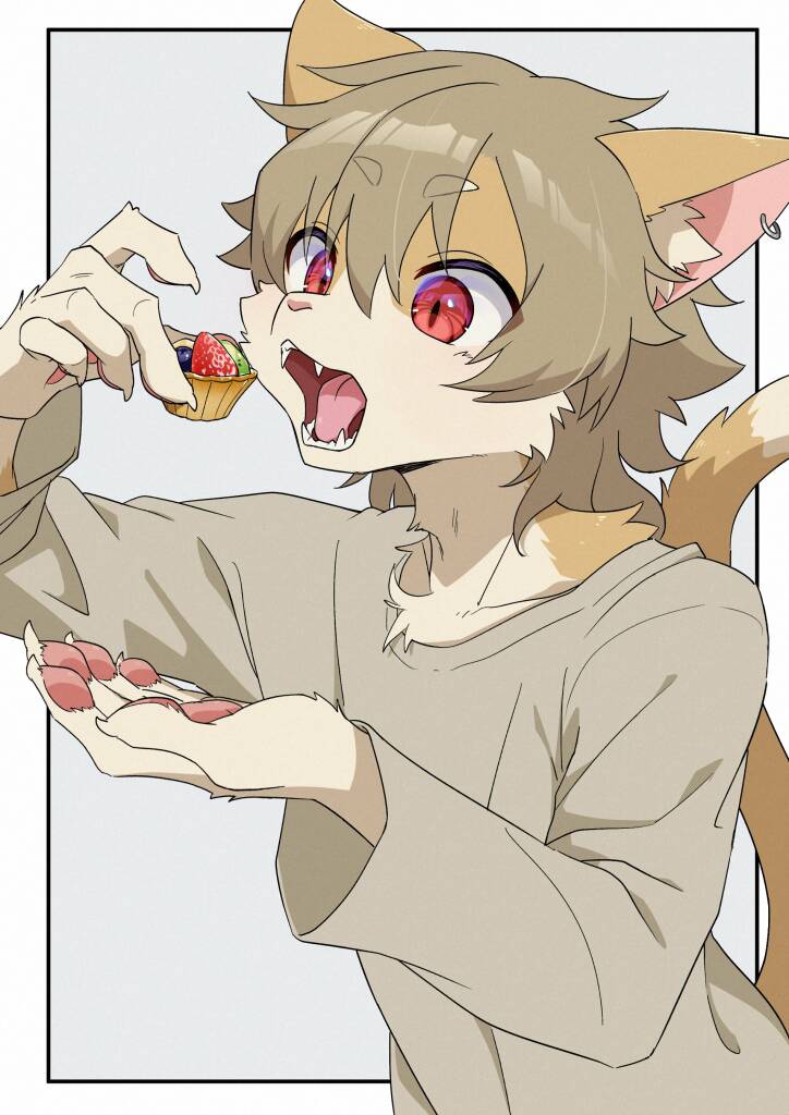 1boy absurdres animal_ear_fluff animal_ear_piercing animal_ears blueberry body_fur brown_fur cat_boy cat_ears cat_tail claws eating fangs food fruit furry furry_male grey_hair grey_shirt highres holding holding_food kiwi(fruit) konazarame long_sleeves male_focus...