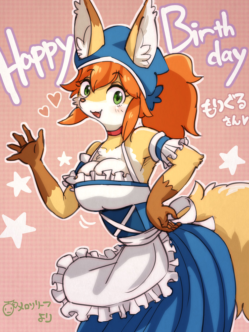2019 5_fingers anthro apron breasts canid canine choker clothing cute_fangs dialogue dress female fingers fox green_eyes hair hi_res japanese_text jewelry mammal melonleaf necklace open_mouth orange_hair simple_background smile solo...