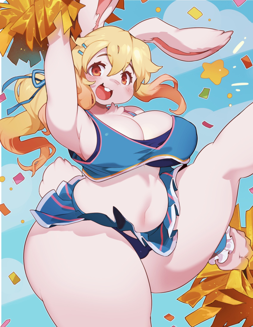 anthro big_breasts blonde_hair blue_clothing blue_panties blue_underwear blush bottomwear breasts cheerleader cheerleader_outfit cheerleading_pose cleavage clothed clothing cloud crop_top curvy_figure digital_media(artwork) female hair hi_res kaeritai07 lagomorph leporid...