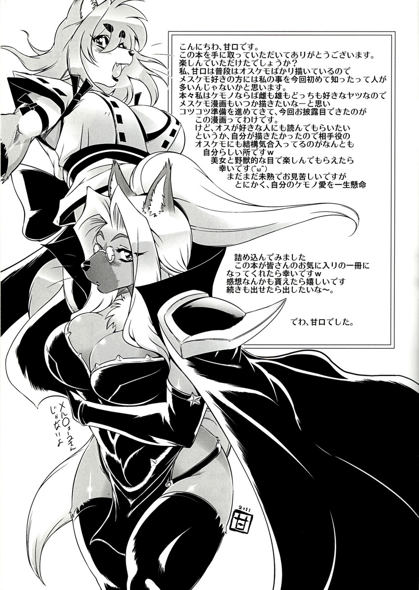 2011 amakuchi anthro big_breasts blush breasts canid canine canis clothed clothing comic domestic_dog duo eyewear female fox foxy-rena glasses greyscale hi_res japanese_text mammal monochrome skimpy text translation_request
