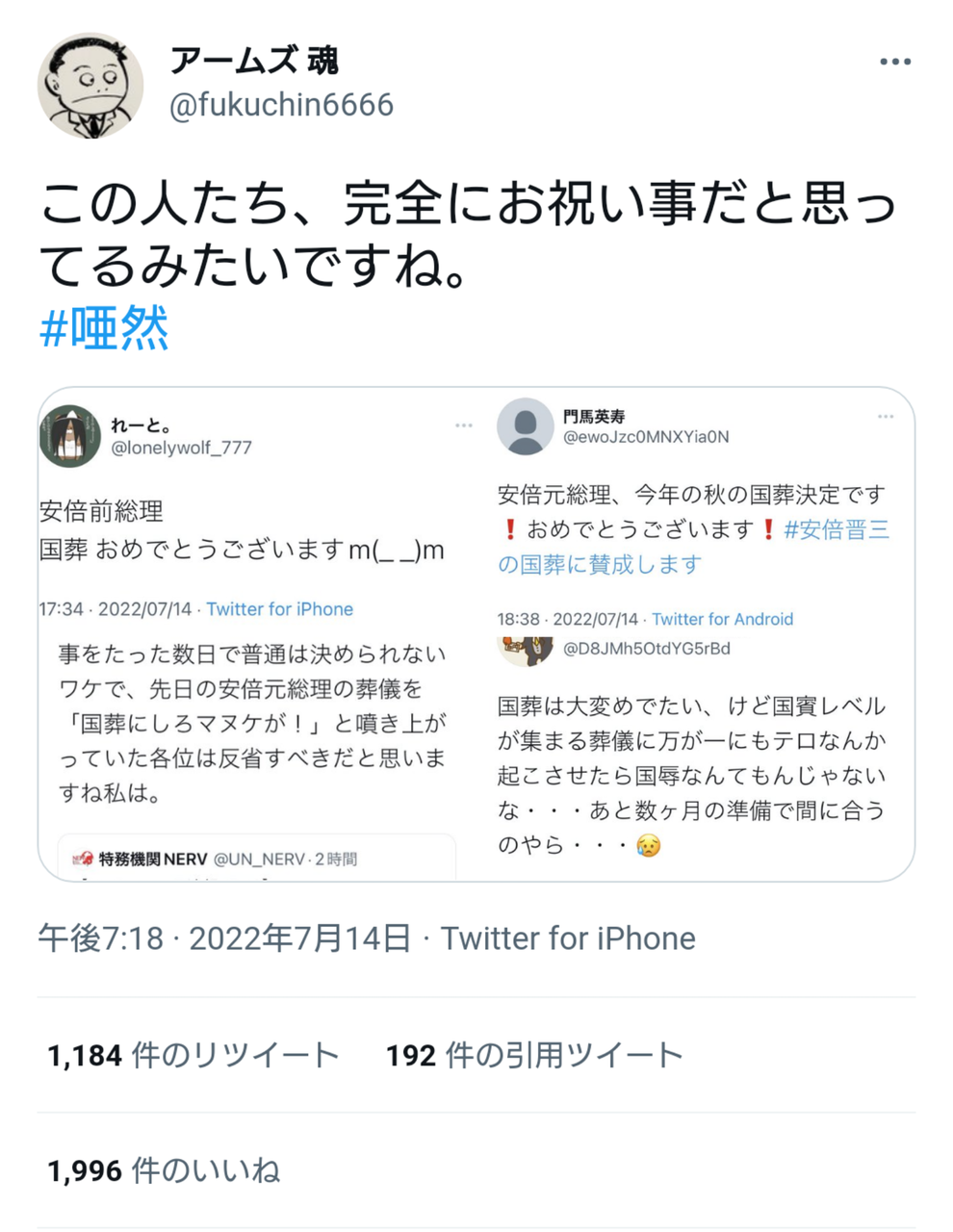 ツ イ ッ タ ラ-(安 倍 支 持 者)"安 倍 さ ん 国 葬 お め で と う ご ざ い ま す.." → 維