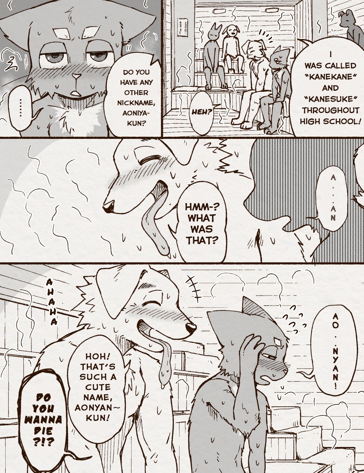 anthro aoniya_yuudai asking asking_another asking_what bar_emanata blush bodily_fluids canid canine canis comic compliment covering covering_face crossbar_emanata dark_ishihara dialogue domestic_cat domestic_dog ellipsis emanata embarrassed english_text eyes_closed felid feline...