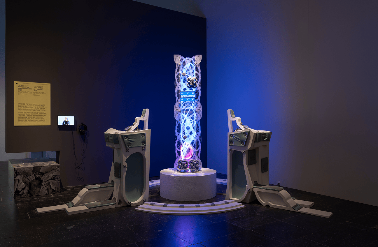 Инсталляция представляет собой спроектированную среду, в которой физические и виртуальные элементы обнажают механизмы взаимодействия человека и ИИ.
