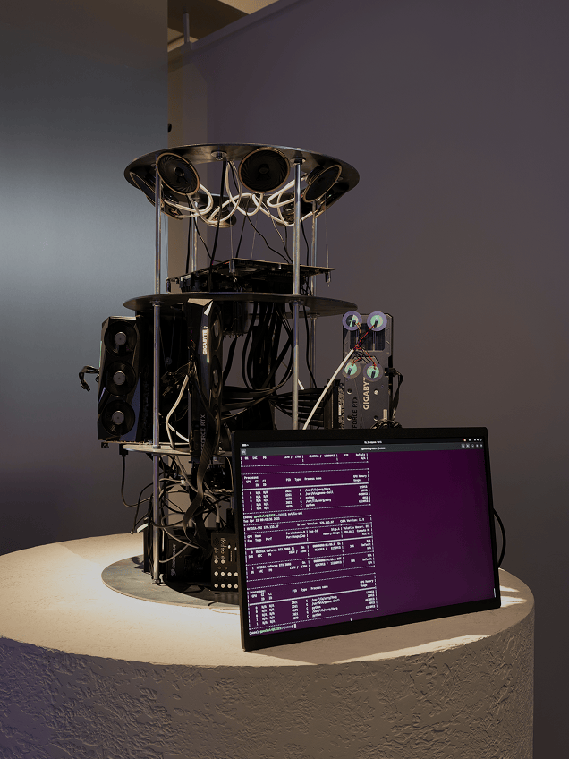 Данная инсталляция представляет процесс генерации и обучения нейросети, обычно скрытый в серверных дата-центрах, в доступной и визуально воспринимаемой форме. На подиуме небольшого диаметра расположены несколько видеокарт, выполняющих непрерывное обучение нейросети. Работа оборудования сопровождается характерным шумом вентиляторов и выделением тепла, что становится аудиовизуальным индикатором вычислительной активности.