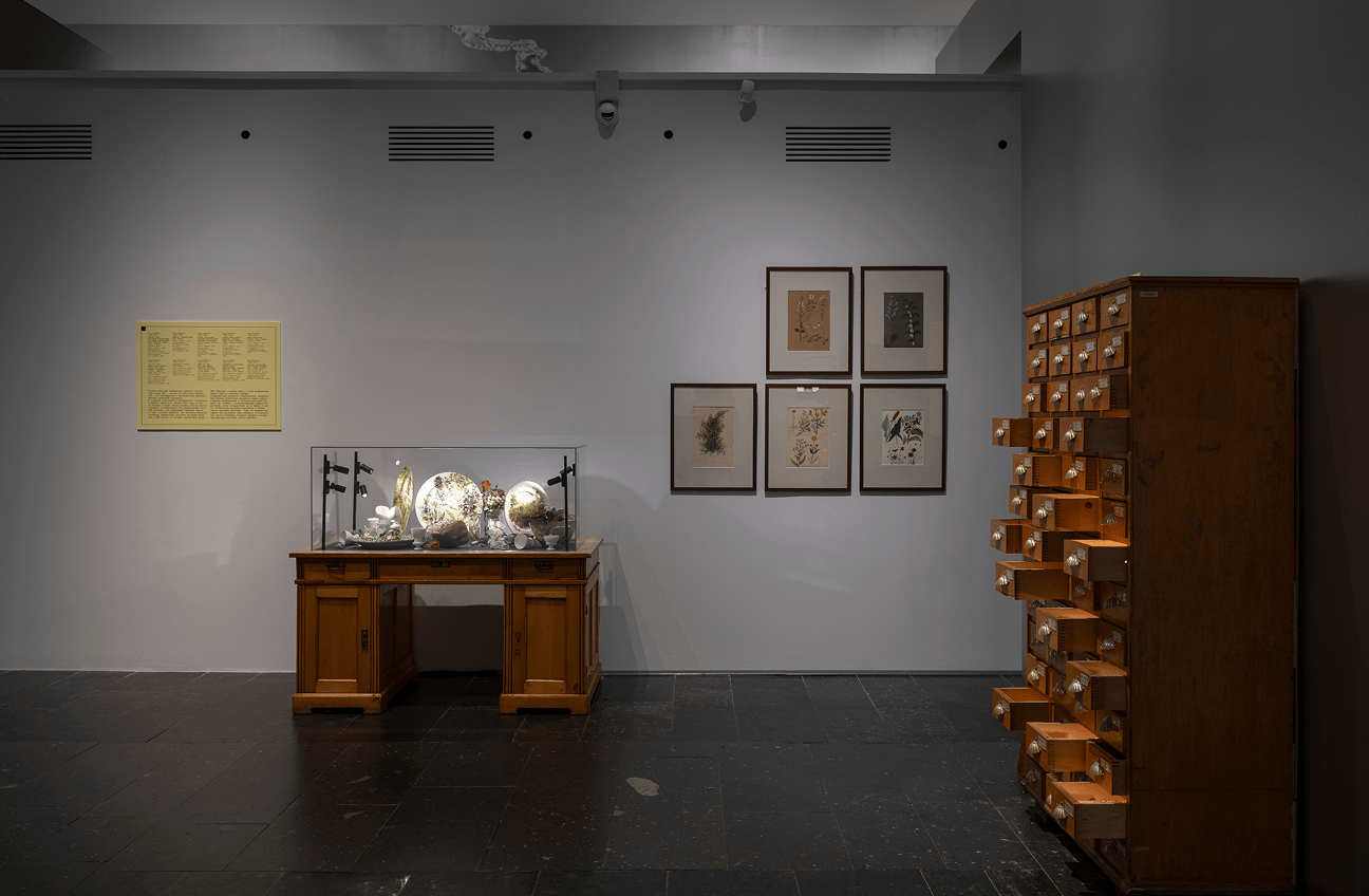 Использованная в этом проекте диффузионная нейросеть обучалась на гербариях скульптора Анны Голубкиной из собрания Третьяковской галереи. Сгенерированные нейросетью изображения новых растений нанесены с помощью лазерной гравировки на стеклянные объекты в картотечных ящиках, а промежуточные «стоп-кадры» работы нейросети художница использовала для изображений на фарфоре.